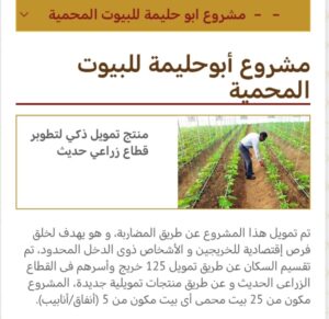 من ضمنها مشروع البيوت المحمية في أبو حليمة الذي وفر خيمًا زراعية حديثة لخريجين وشباب عاطلين هذه المبادرات أتاحت للمشاركين فيها فرصة إنشاء أعمال مدرة للدخل وتغيير حياتهم نحو الأفضل. وقد حققت برامج التمويل الأصغر نجاحًا ملموسًا