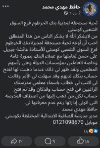 تحية مستحقة لمديرة بنك الخرطوم فرع السوق الشعبي كوستي