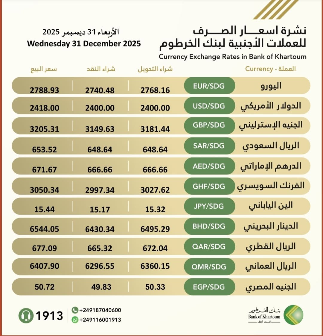 نشرة #اسعار_الصرف_للعملات_الاجنبية في بنك الخرطوم ليوم الأربعاء، الموافق 31 ديسمبر 2025م.
