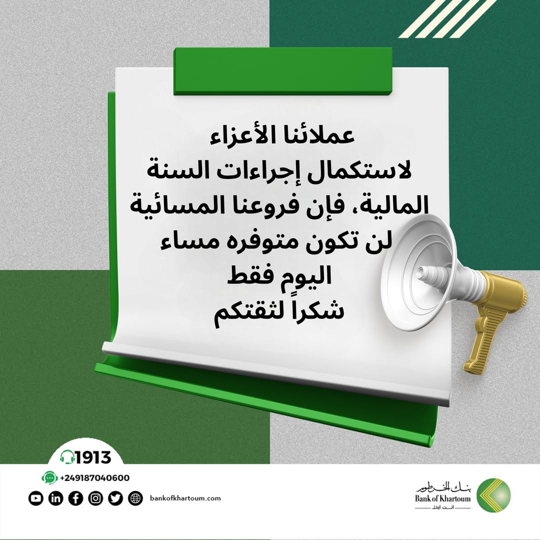 عملائنا الأعزاء، لاستكمال إجراءات السنة المالية، فإن فروعنا المسائية لن تكون متوفره مساء اليوم فقط.