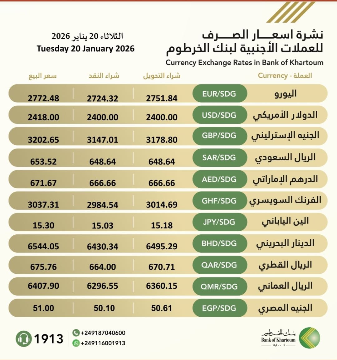 نشرة #اسعار_الصرف_للعملات_الاجنبية في بنك الخرطوم ليوم الثلاثاء، الموافق 20 يناير 2026م.