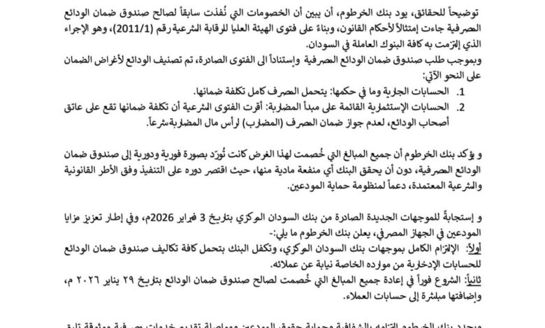 أولا: الإلتزام الكامل بموجهات بنك السودان المركزي، وتكفل البنك بتحمل كافة تكاليف صندوق ضمان الودائع للحسابات الإدخارية من موارده الخاصة نيابة عن عملائه. ثانيا: الشروع فوراً في إعادة جميع المبالغ التي خُصمت لصالح صندوق ضمان الودائع بتاريخ ۲۹ یناير ٢٠٢٦ م، وإضافتها مباشرة إلى حسابات العملاء.