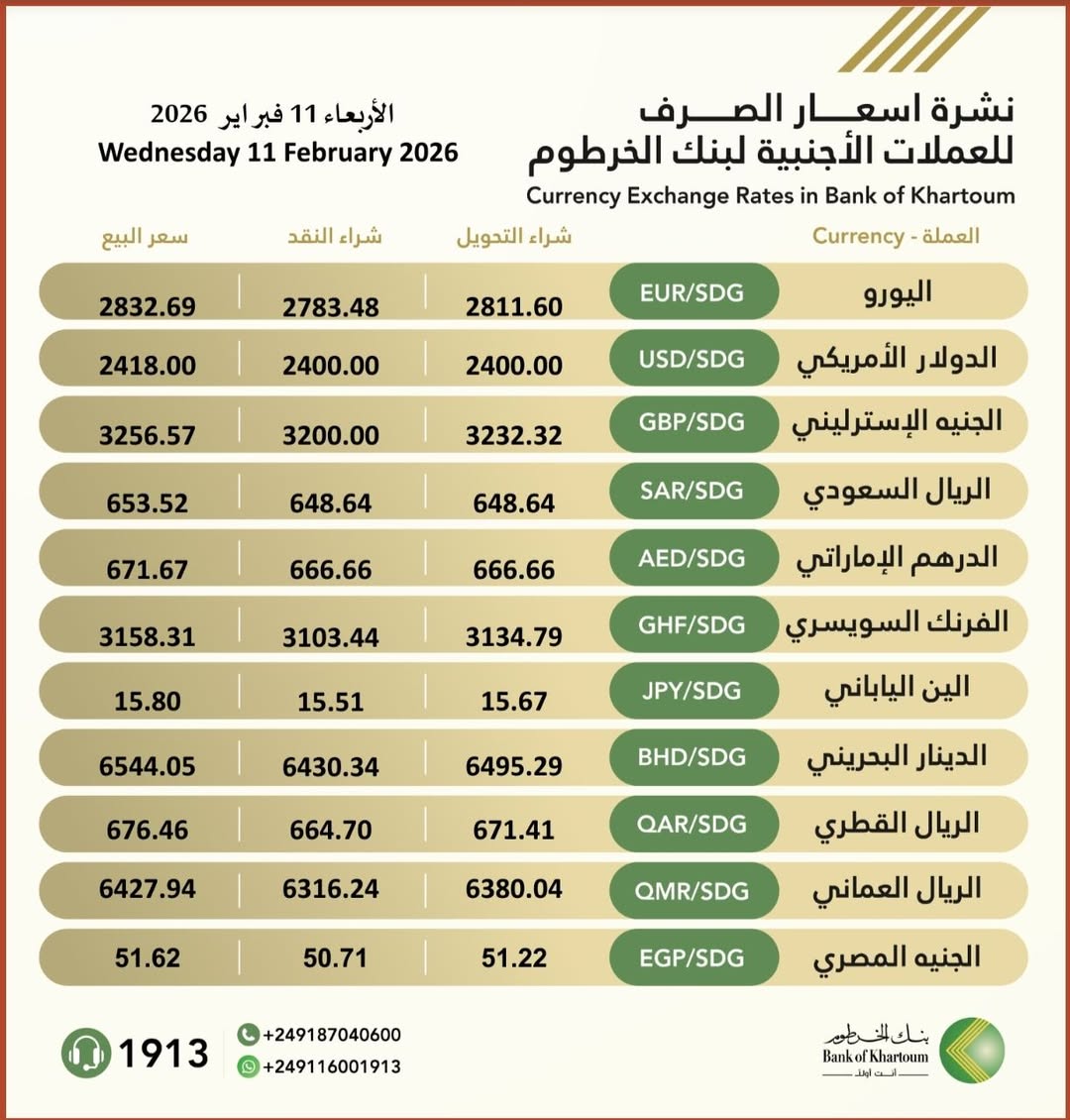 نشرة #اسعار_الصرف_للعملات_الاجنبية في بنك الخرطوم ليوم الأربعاء، الموافق 11 فبراير 2026م.
