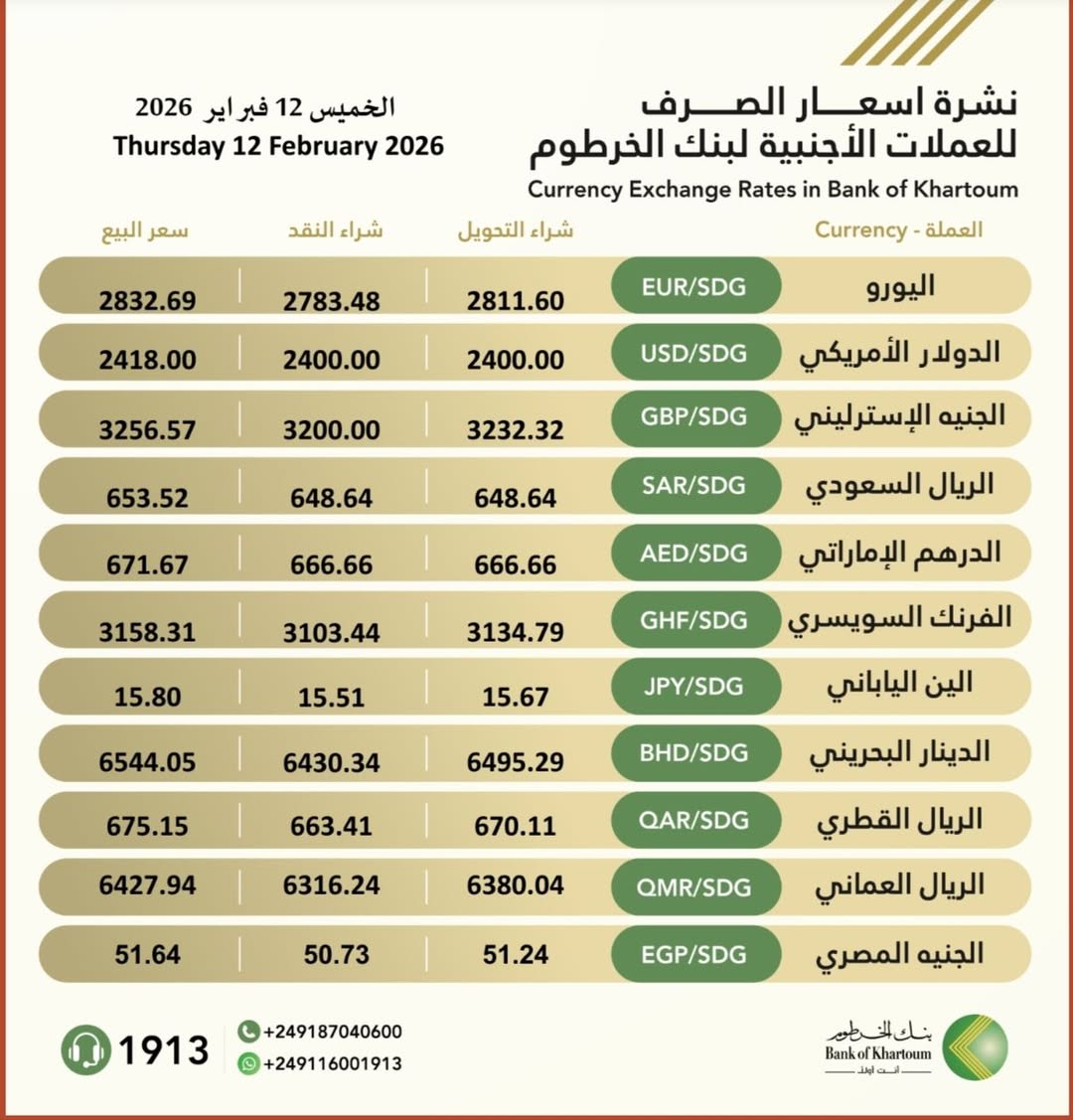 نشرة #اسعار_الصرف_للعملات_الاجنبية في بنك الخرطوم ليوم الخميس، الموافق 12 فبراير 2026م.