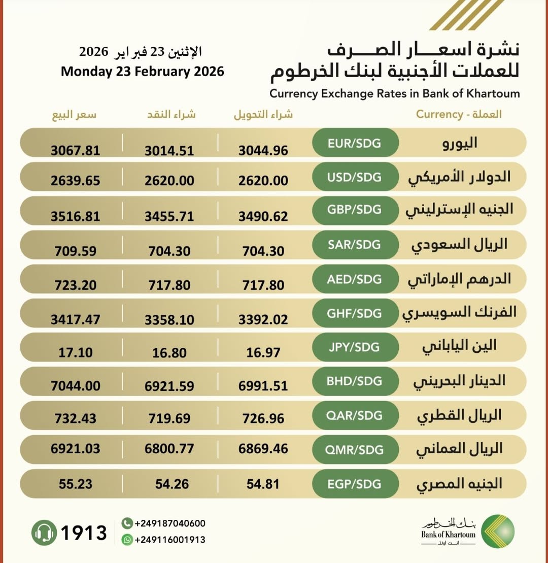 نشرة #اسعار_الصرف_للعملات_الاجنبية في بنك الخرطوم ليوم الإثنين، الموافق 23 فبراير 2026م.