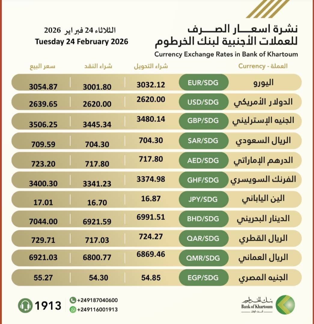 نشرة #اسعار_الصرف_للعملات_الاجنبية في بنك الخرطوم ليوم الثلاثاء، الموافق 24 فبراير 2026م.