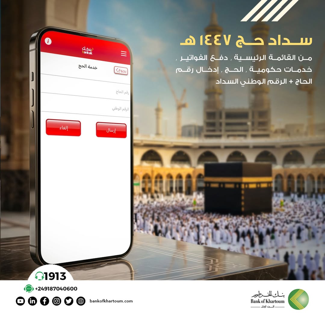 يتقدَّم #بنك_الخرطوم بأسمى التهاني للشعب السوداني بمناسبة حلول #موسم_الحج للعام 1447هـ أعاده الله على الأمة الإسلامية بالخير واليمن والبركات، وفي ظل التعاون المشهود على مر السنوات الماضية بين بنك الخرطوم والمجلس الأعلى للحج والعمرة، يسر البنك أن يواصل مسيرته في خدمة حجاج بيت الله الحرام ، وبذلك يعلن عن بدء التقديم للحج عن طريق خدمة السداد الإلكتروني -حصريًا- عبر تطبيق #بنكك بإستخدام الحساب المصرفي وذلك إعتباراً من تاريخ 8/4/2026