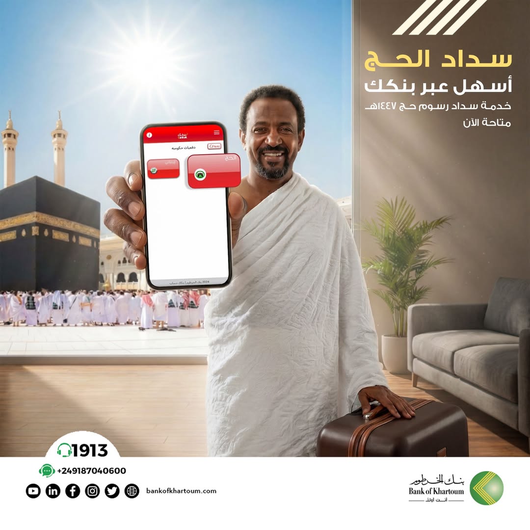 يتقدَّم #بنك_الخرطوم بأسمى التهاني للشعب السوداني بمناسبة حلول #موسم_الحج للعام 1447هـ أعاده الله على الأمة الإسلامية بالخير واليمن والبركات، وفي ظل التعاون المشهود على مر السنوات الماضية بين بنك الخرطوم والمجلس الأعلى للحج والعمرة، يسر البنك أن يواصل مسيرته في خدمة حجاج بيت الله الحرام ، وبذلك يعلن عن بدء التقديم للحج عن طريق خدمة السداد الإلكتروني -حصريًا- عبر تطبيق #بنكك بإستخدام الحساب المصرفي وذلك إعتباراً من تاريخ 8/4/2026
