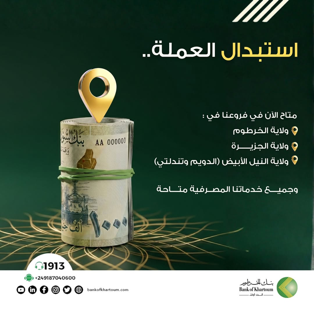 عملائنا الأكارم، يعلن #بنك_الخرطوم عن إتاحة خدمة استبدال العملة في جميع فروعه بولايتي #الخرطوم و #الجزيرة، إضافة إلى عدد من الفروع بولاية #النيل_الأبيض (الدويم وتندلتي)، وذلك لتسهيل الإجراءات وتقديم الخدمة لأكبر شريحة من العملاء بكل سلاسة ومهنية.