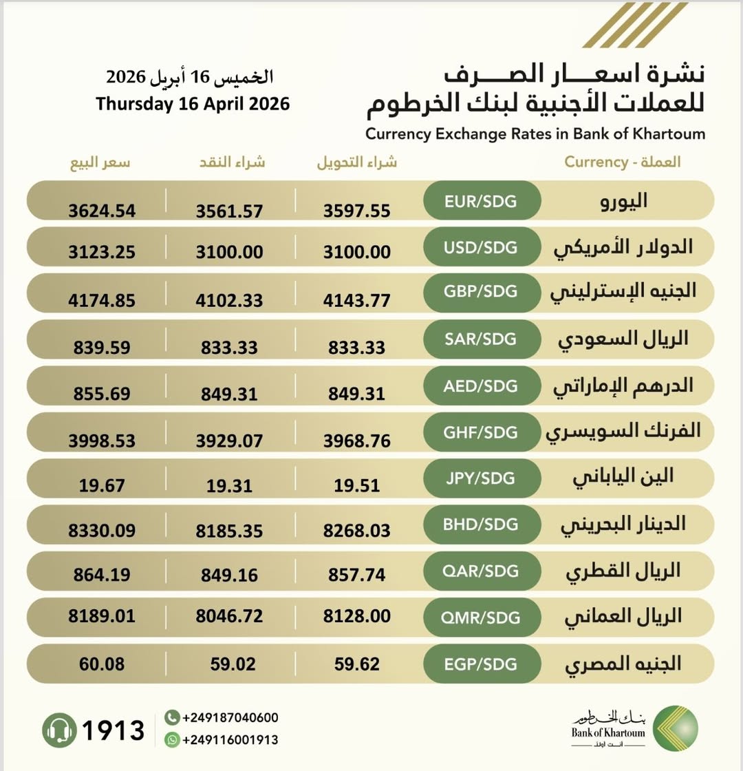 ‏نشرة ‎#اسعار_صرف_العملات_الاجنبية في بنك الخرطوم ليوم الخميس، الموافق 16 أبريل 2026م.